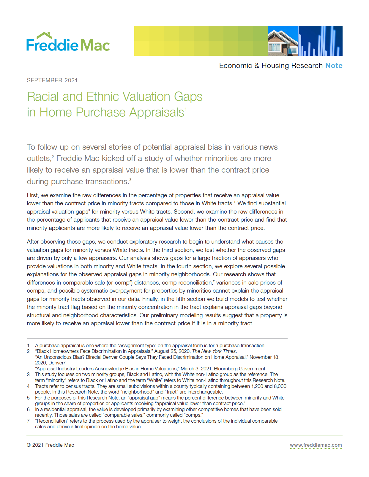 FreddieMac's Research Note is unique from all other appraisal bias research at the time of its publication because it utilizes actual mortgage valuations to assess systemic racial bias in the standard home valuation methodology. FreddieMac is a publicly traded, government-sponsored entity (GSE) charged with providing liquidity, stability, and affordability to the US housing market by purchasing and securitizing home loans. As a GSE, FreddieMac is one of 3 entities with access to the data that can definitively assess racial bias in the appraisal methodology.