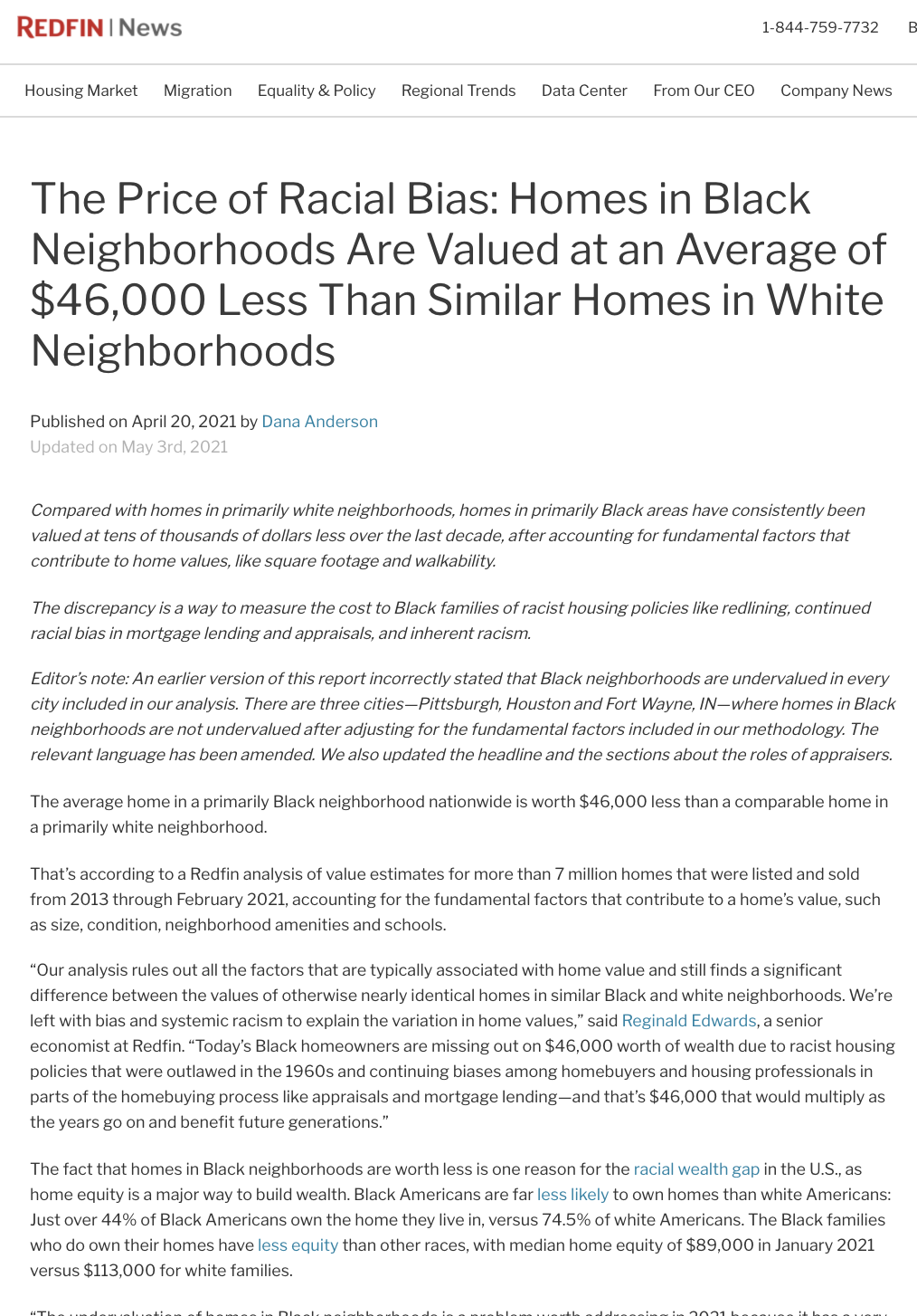 This article summarizes the research of on of the largest US real estate brokerage firms, Redfin, which confirms Brookings findings of race-based systemic appraisal bias. Their research estimates undervaluation averages $46,000 per home. In April 2022, Redfin settled a lawsuit brought by 10 fair housing organizations alleging Redfin’s minimum home price violated the Fair Housing Act by discriminating against sellers and buyers of homes in communities of color. The plaintiffs alleged that policies at Redfin could perpetuate racial segregation and contribute to the racial wealth gap.